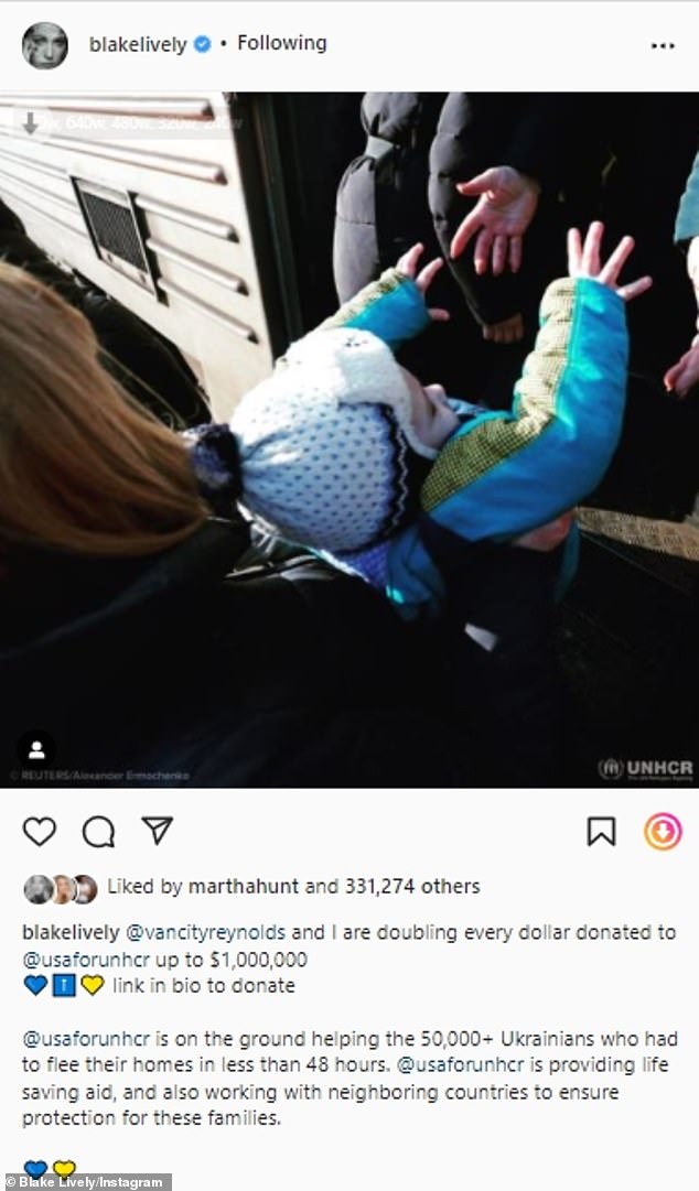 가십걸등에 출연했던 블레이크는 . '@vancityreynolds와 나는 @usaforunhcr에 기부되는 모든 $1,000,000의 바이오 링크를 기부하기 위해 두 배로 늘리고 있습니다.