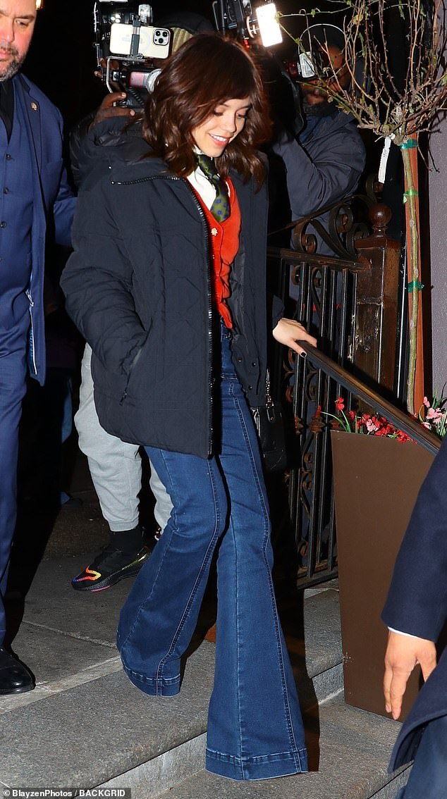 제나 오르테가 (Jenna Ortega)는 검은색 겨울 코트를 입고 보온성을 유지했으며 그녀의 밝은 빨간색 정장 조끼와 부츠컷 청바지를 매치했다. 그녀는 깃털이 달린 웨이브에 갈색 머리를 하고 그녀의 결점 없는 안색이 절제된 글래머로 빛나도록 했다.
